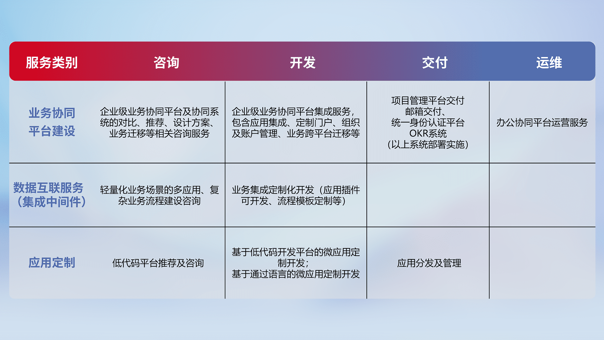 针对钉钉、、企微、、IDaas等平台级产品提供产品的规划、、、、方案、、交付、、定制化开发等服务,,,,实现如统一协同办公、、智能客户服务、、、、混合会议管理、、、智能数据查询、、、等业务场景,,,,实现数字化转型。。。。