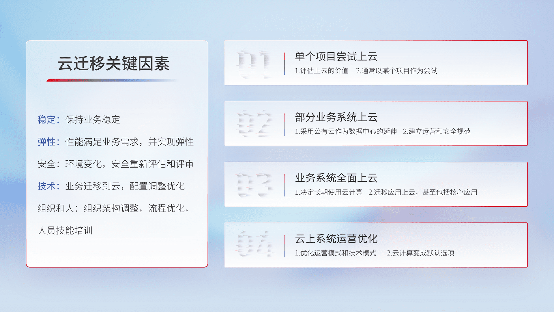 结合实际业务,,,,从规划设计、、云平台选型、、、云原生改造、、数据迁移、、集成交付,,迁移全过程为客户识别最佳上云路径,,做好风险识别管理,,,设计网络架构、、、、身份权限、、、、安全审计合规、、、操作审计、、日志审计、、监控告警策略、、、多站点容灾设计等,,,对云上基础设施进行整体规划,,,,提升IT治理水平,,,,以满足弹性、、、高可用、、高性能的需求。。