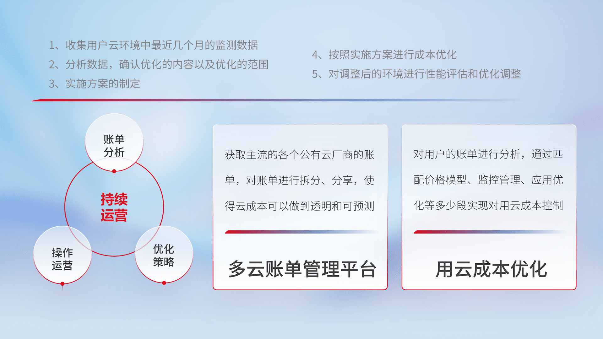 通过多云纳管,,,以统一的资源数据模型把客户的云资源进行抽象和封装,,,,进而实现对多云资源的统一操作,,,,保障云资源管理的可靠性、、、稳定性与可用性。。。量身定制化运维内容,,,配置、、开发运维、、、补丁管理、、、备份、、监控、、认证和访问管理、、、、审计和日常巡检等,,,保障在用云过程中的可靠度,,稳定度以及高可用率。。。