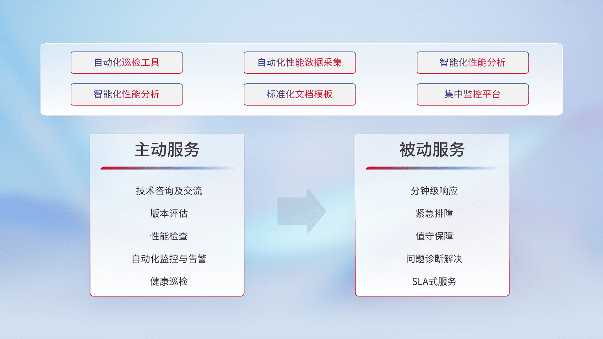智能化工具和标准化文档,,,保障服务质量,,提供主动服务(包含技术咨询、、、、版本评估、、、性能检查、、、自动化监控与告警、、、健康巡检)和被动服务包含(分钟级响应、、、紧急排障、、、、值守保障、、、、问题诊断解决、、SLA服务)。。。。
